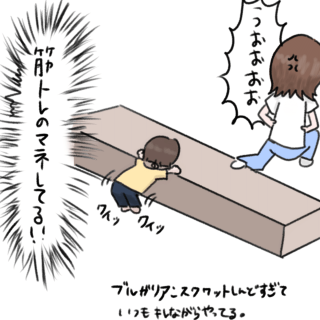 お母さん、結構ハードなスクワットしてたから思わず吹き出してしまったよ。