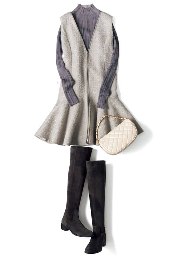 コンパクトなボトム合わせが定番だったけど、 今季は変化球で。ボリューミーなスカートに合わせるだけで、グッと鮮度がアップ。裾が大きく波打つジャンスカならボリューム裾と太ももとのメリハリがついて華奢見え! 締め色のロングブーツで、直線的な美脚を演出。