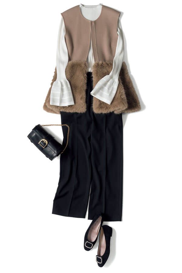 パンプス¥23,100/銀座かねまつ(銀座かねまつ6丁目本店) ジレ¥31,900/アプワイザー・リッシェ ニット¥4,950/オペーク ドット クリップ パンツ¥10,450/リリアンカラット バッグ¥19,250/ ダイアナ(ダイアナ 銀座本店)