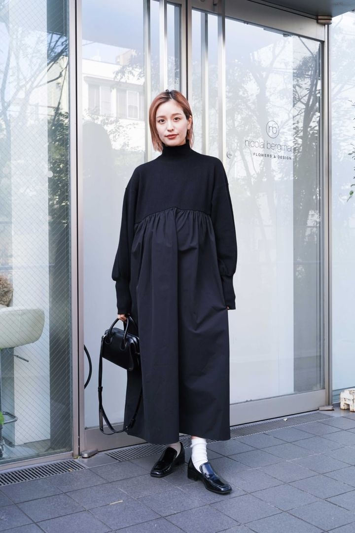 妊娠後期の大きなお腹でも着れるドレスを愛用中。「ショート丈ニットのような胸下の切り替えが妊娠中でもバランスよく。今日は白ソックスにローファーをあわせて、モノトーンスタイルの中に少し甘さをプラスしました」