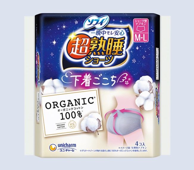 ショーツ型の、はくナプキン。腰まで全面ガードで後ろモレを防ぎ、デリケートゾーンの上層はオーガニックコットンを使用。肌にやさしいはき心地。4個入り¥660(ユニ・チャーム TEL:0120・423・001)