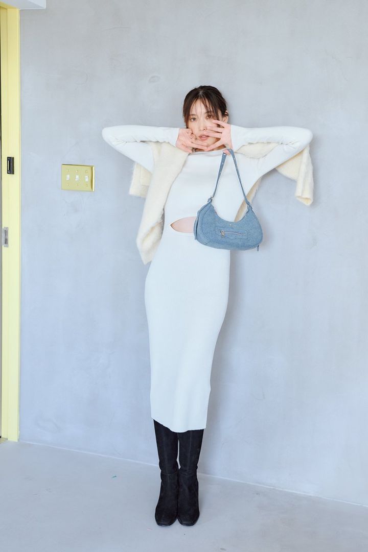 可愛いけれど時に甘さがトゥーマッチになりやすいホワイトニット。そこで手っ取り早くカジュアルダウンできるデニムバッグの出番。簡単にコーデに立体感が生まれ、腹チラもヘルシーに見える棚ぼた的効果も。