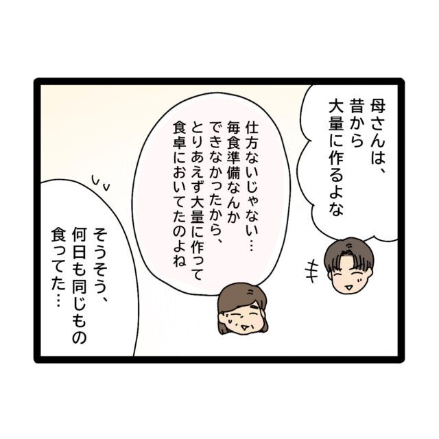 「仕方ないじゃない・・毎食準備なんかできなかったから、とりあえず大量に作って食卓においてたのよね」