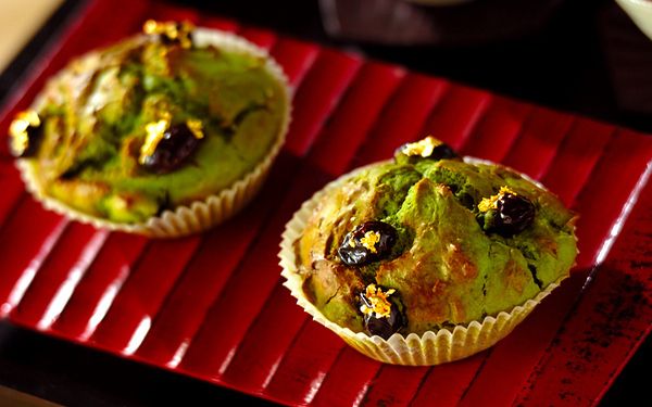 抹茶の緑色と黒豆、金箔が華やかでお正月はもちろん、パーティーにもぴったりなマフィンです。ポイントはクリームチーズを入れていること。黒豆とチーズは相性が良いのはもちろん、マフィンがしっとり仕上がる効果もありますよ。焼き色が付きすぎないように、途中でアルミホイルをかけると良いでしょう。