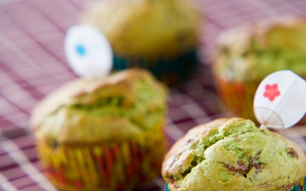 クリームチーズやイチゴジャム、小豆など風味の異なる食材を組み合わせたマフィンは、意外なほど美味。味わいの違いを堪能するため、全体をさっくり混ぜましょう。抹茶のほろ苦さが全体を上手にまとめて、くせになる味です。
