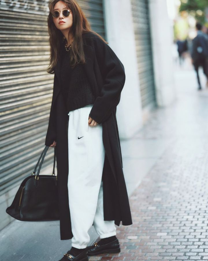 スウェットパンツ¥9,020(ナイキ スポーツウェア/NIKE カスタマーサービス)コート¥91,300(カオス/カオス丸の内)ニット¥55,000(THIRD MAGAZINE)バッグ¥286,000(J&M デヴィッドソン/J&M デヴィッドソン カスタマーセンター)ソックス¥1,100(靴下屋/タビオ)ローファー¥116,600(トッズ/トッズ・ジャパン)サングラス¥23,890(レイバン/ルックスオティカジャパン カスタマーサービス)ネックレス¥49,500(ソコ/ZUTT OHOLIC)