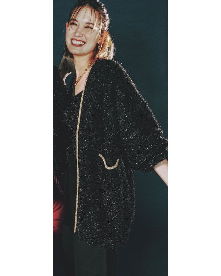 黒アイテムばかりでマンネリしがちなこの時季は、きらびやかなラメニットで新鮮さをプラス。定番カラーだからこそエッジの効いたデザインでも悪目立ちせず、他と差がつきます。存在感のある上半身をベーシックなパンツで引き立てて、バランスを調整するのがポイントです。