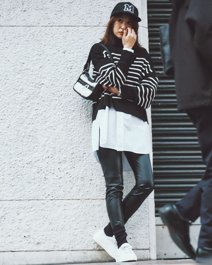 これまで防寒対策やワンマイルコーデで活躍していた名脇役の「レギンス」は、今年コーデの主役になるほどの大本命アイテムに。スポーティになりすぎないようモードなレザー素材を選べば、都会的で浮かない着こなしが叶います。インナーはクリーンな白シャツをレイヤードして、気になるヒップ周りをカバー。モノトーンのコントラストと異素材MIXが、コーデにメリハリを加わえます。