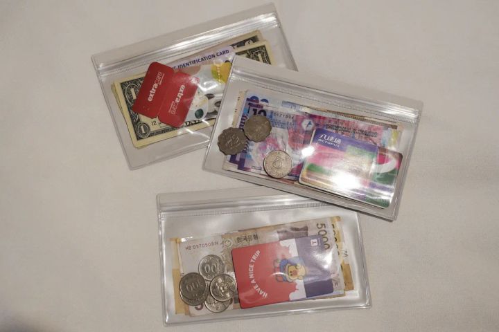 今の所どの国のお札も折らずに収納できていて、チャックで封ができるのも機能的。片面が透明になっているので、どこの通貨なのか一目瞭然。お札とコイン、現地の交通ICカード類も一緒に保管しています。