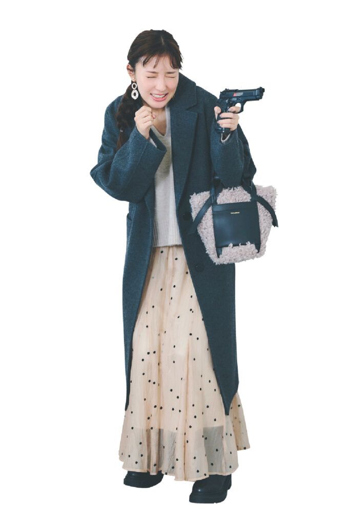チェスターコート着回し ニット¥2,490(GU)スカート¥25,300(ジャスグリッティー/ジャスグリッティー プレスルーム)バッグ¥24,200(ヴィオラドーロ/ピーチ)ブーツ¥3,990(GU)イヤリング¥5,500(アビステ)