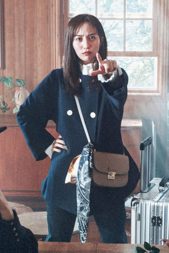 金ボタンコート着回し フリルブラウス¥39,600(ル ブーケ/ザ ショップ スローン 新静岡セノバ店)リジッドデニム¥23,100(レッドカード トーキョー/ゲストリスト)バッグ¥159,500(ボナベンチュラ)スカーフ¥14,300(マニプリ)ブーツ¥41,800(ダイアナ/ダイアナ 銀座本店)スーツケース¥276,100(リモワ/リモワ クライアントサービス)