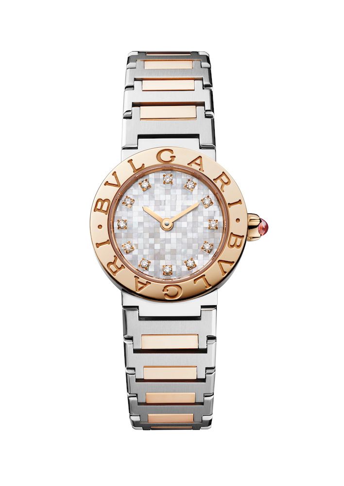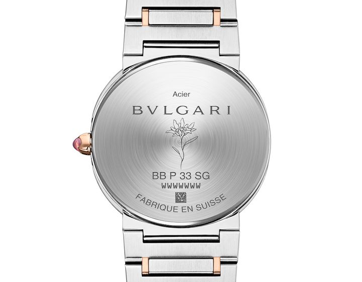 ピンクゴールドのベゼルの上に「BVLGARI BVLGARI」の文字が燦然と輝き、またダイヤルではマザーオブパールのモザイクが繊細かつ優しげに光を反射します。400ピースを超えるマザーオブパールの細かなスクエアは、幾何学的なモチーフを生み出すため1つ1つカットされ、ダイヤル上に組み合わされたもの。コンテンポラリーなダイヤルの上では12石のダイヤモンドが時を刻みます。プレシャスなステンレススティールとピンクゴールドのリューズには、ブルガリの美しきシグネチャーのひとつであるカボションカットのルベライトをセット。時計製造発祥の地スイスで誕生した「ブルガリ・ブルガリ LISA 限定モデル」は、エレガントなスティールおよびピンクゴールドのブレスレットとフォールディングバックルで手首により添います。