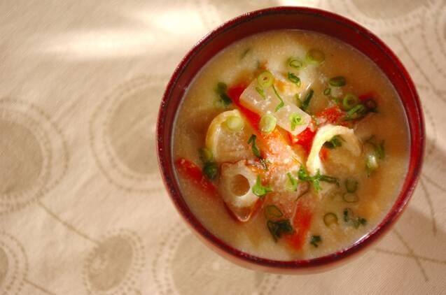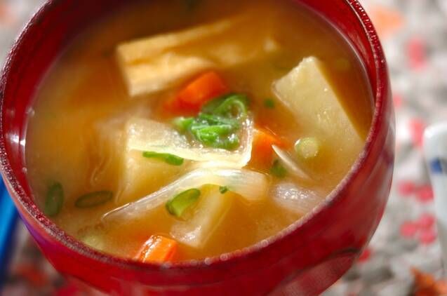 大根、ニンジン、玉ネギなどの定番野菜を入れた具だくさんのみそ汁です。食べ応えがあり栄養価も高いのでオススメです。