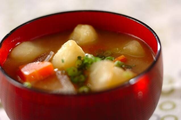 ジャガイモで団子を作り、具だくさんのみそ汁に入れて食べましょう。芋団子は冷凍保存が可能です。忙しい日に役立つのでたくさん作っておくと良いでしょう。