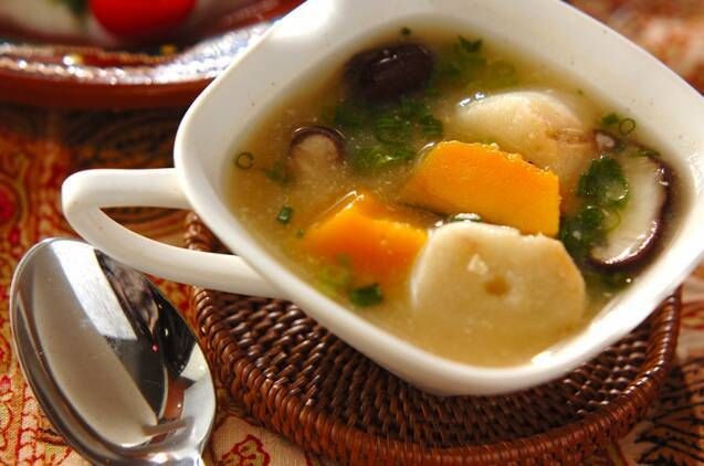 カボチャが甘くて美味。ほうとうみたいに味わえる具沢山のみそ汁は根菜がたくさん入って栄養満点。カボチャは大きめに切って存在感UP!