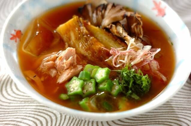 暑い日や食欲がない時にオススメのひんやり、香ばしいみそ汁です。焼いたナスがトロトロで美味。ご飯や素麺を入れても良いですね。冷汁のような味わいの一杯です。