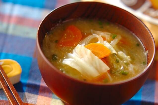 火を通すと甘みが増すキャベツが入ったみそ汁です。ニンジンも入れて彩りよく。みそは野菜がくったりしてから入れてください。
