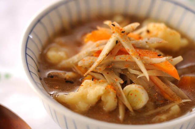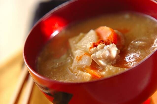 定番の豚汁の豚肉を鶏肉に代えたみそ汁です。鶏肉から出るコクのある出汁も、みそと良く合いますよ。根菜類だけでなく、ほうれん草や小松菜などを加えても良いでしょう。