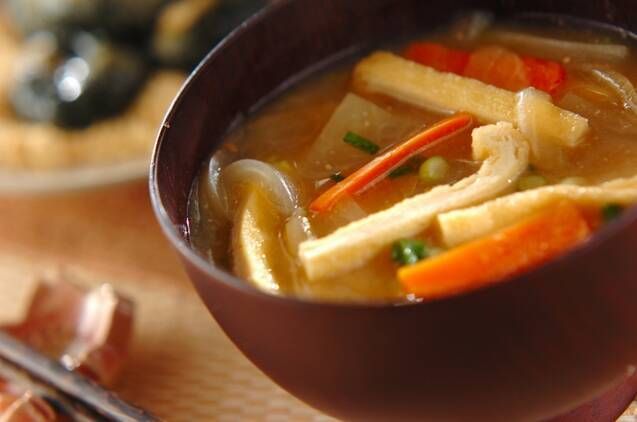 具沢山のみそ汁といえば豚汁が筆頭ですね。豚の旨味と野菜の甘さがだし汁に溶け出し一杯で大満足のごちそうみそ汁です。豚汁はごはんに合わせるだけでなく、うどんを入れて豚汁うどんにしても良いですね。根菜類を摂取できるのでたっぷり作っておきましょう。
