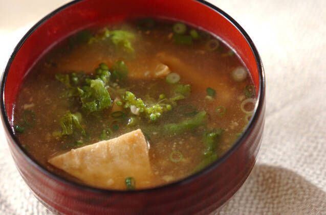 菜の花のほろ苦さに厚揚げのジューシーさがマッチした食べ応えのあるみそ汁です。菜の花だけでなく、旬の葉物で作れます。季節感も楽しめる一杯です。