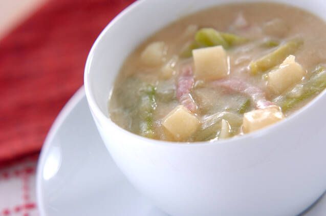 ジャガイモやベーコンなど具沢山のみそ汁に豆乳を加えてマイルドに仕上げた一杯は、片栗粉でとろみをつけるのでシチューのような仕上がりになります。