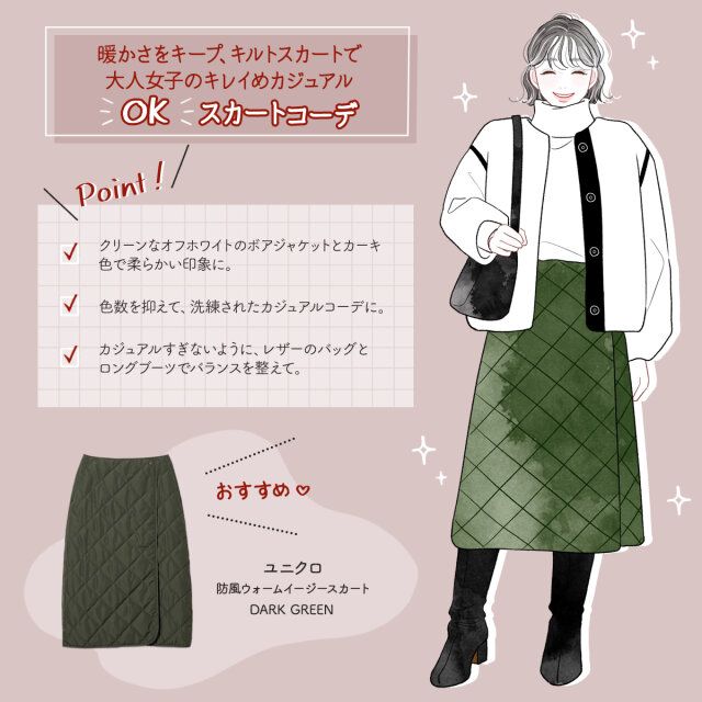 暖かさをキープ!キルトスカートで大人女子のキレイめカジュアルOKスカートコーデ