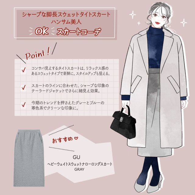 シャープな脚長スウェットタイトスカートのハンサム美人OKスカートコーデ