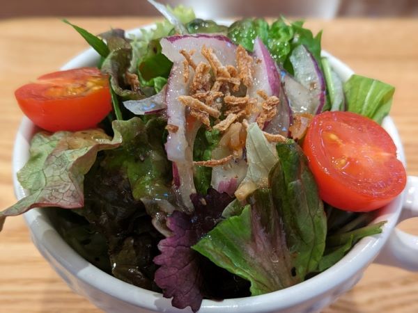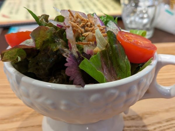 ボリューミーです!ランチセットのサラダとは思えないくらい、深いカップにモリモリに入っています。サニーレタスとミックスベビーリーフ、ミニトマトなど種類も豊富で、とっても新鮮です。