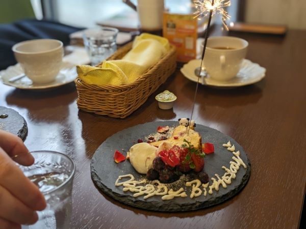 おいしくいただいていると、突如BGMが大音量に!誕生日の曲が店中に響き渡ります。何々?と思っていると、お隣のカップルの元に、こちらが運ばれてきました。