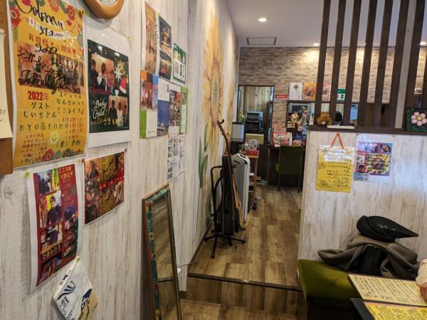 お誕生日だったのですね♪思わず私も拍手♪Cセットのデザートが、お誕生日プレートになるサービスがあるそうです。(予約が確実)ランチのコーヒーはオーガニック、そして選べるデザートのガトーショコラ、バスクチーズケーキ、カタラーナは全てオーナーさんの手作りですので、今度は食べてみたいと思います。 そして、店内に置かれたギターがとても気になっていたのですが、こちらはライブ会場としても使用することができます。(要予約)