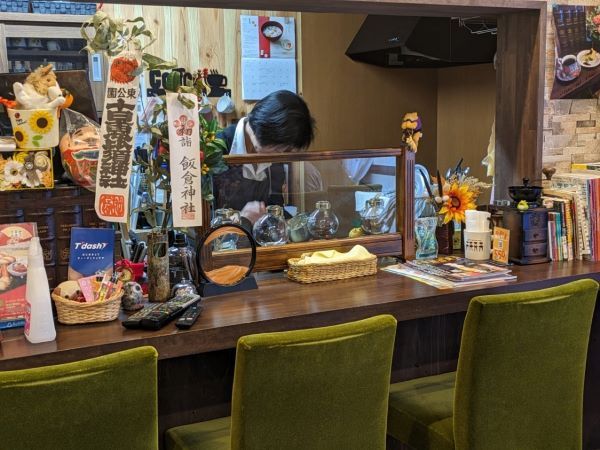 家庭的な雰囲気のするお店のドアを開けると、中は温かな光が差し込むホッとする空間。手前にはテーブル席が一つ。脇を通って奥に入っていくと、4人がけと2人がけのテーブル席が一つずつあります。