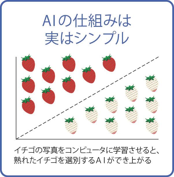 「AIが意思を持って勝手に動き出すとかいう噂がありましたが、AIの原理としては〝イチゴが赤いか白いか〟をやっているだけ。生成AIにしても、イチゴのデータを人間が〝食わせて〟いるからこそ、ちょうどいい感じのイチゴを取り出せるだけなんですね」