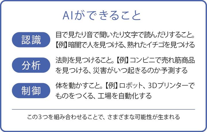 「AIとは、生命の行う知的な振る舞いを人工的に再現しようとするもの……と言うと難しく聞こえますが、実は認識・分析・制御(下表参照)の3つで言い表すことができます」(松田さん・以下同)