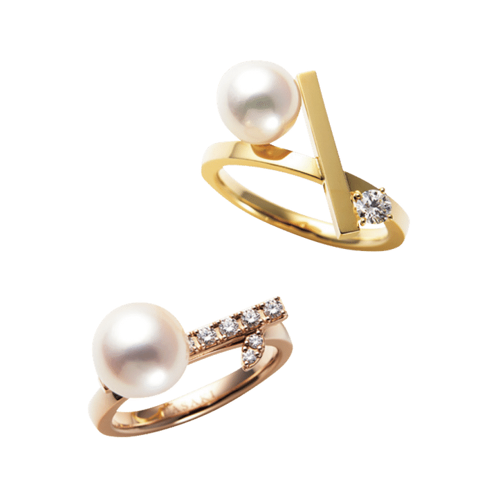 【モデル着用】地金のカラーをMIXして華やかに。人さし指:〈バランス クロス〉リング[K18YG×あこや真珠×DIA]¥427,900、薬指:〈クーゲル〉リング[K18YG×あこや真珠×DIA]¥452,100(共にTASAKI)