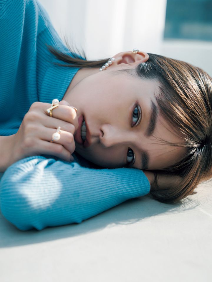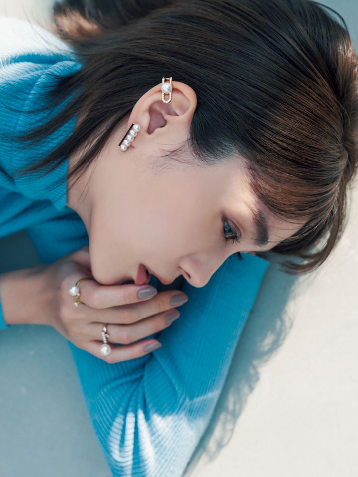 【モデル着用】自分好みにレイヤード。耳上から:〈ファイン リンク〉イヤーカフ[K18YG×あこや真珠×DIA]¥330,000、〈バランス プラス〉イヤリング[K18SG×あこや真珠]¥396,000(共にTASAKI)