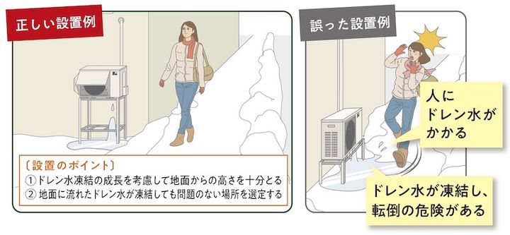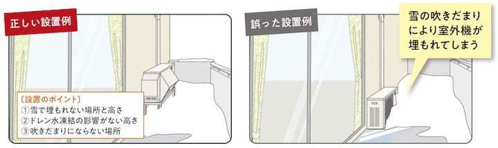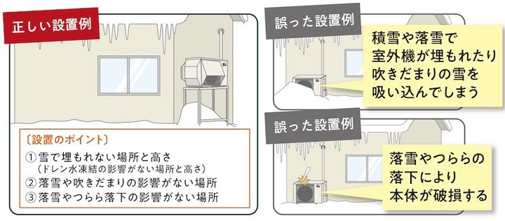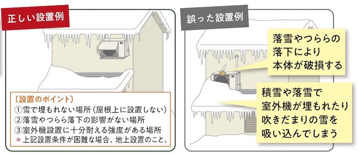 壁面用据付台などを使い、積雪・落雪・つららなどの影響を受けにくい場所へ設置しましょう。また、ドレン水の排水にも注意してください。