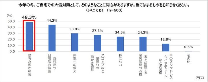 自宅での大雪対策に関しては「室内の寒さ対策」48.3%が一位。