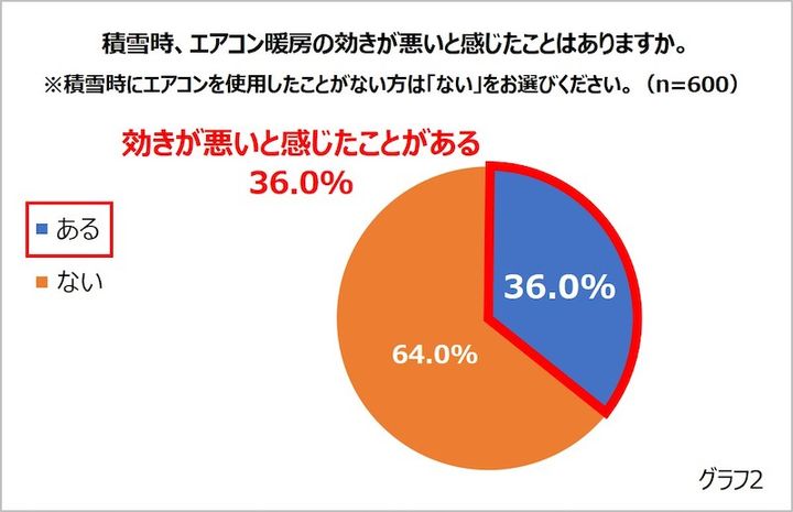 積雪時のエアコンの不具合について聞いたところ、36.0%の方が「エアコン暖房の効きが悪いと感じたことがある」と回答。