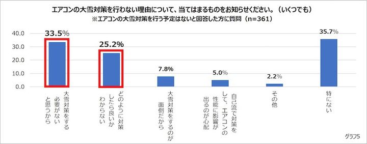 理由としては、「大雪対策をする必要がないと思うから」33.5%、「どのように対策したら良いかわからない」25.2%が上位に。