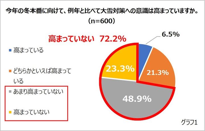 昨年度、東京23区でも大雪警報が発表されるなどしたものの、「大雪対策への意識が高まっていない」と回答した方が72.2%という結果に。