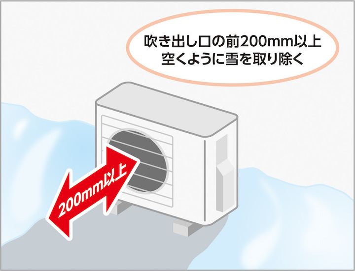 エアコンの電源は入れず、シャベル等で吹き出し口の前が200mm以上空くように雪を取り除く。