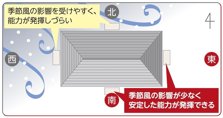 家の北側や西側は季節風の影響を受けやすく冬場などは、北側や西側に設置すると、雪が室外機に吹き込んでしまい、室外から熱をくみ上げにくくなるため、安定した稼働を実現できない可能性があります。そのため室外機の設置場所は、家の東側か南側を選ぶのがおすすめです。