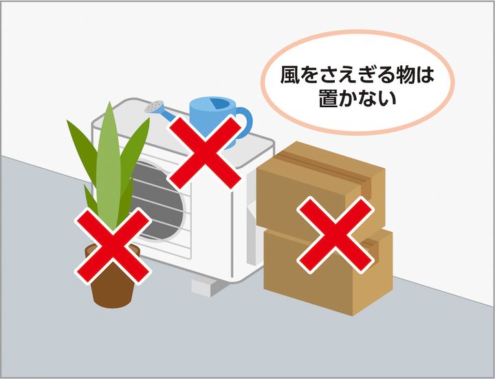 あらかじめ室外機周辺を掃除し、ファンの前や横に風をさえぎる物を置かないようにして、十分なスペースを確保しておく。ファンの前や横に観葉植物や段ボールなどの障害物を置いていると、風を遮り、室外機の正面に雪が積もってしまう可能性があります。室外機周辺の風通りを良くするために、動かせるものはできるだけ片づけておきましょう。
