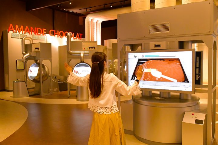 カカオの栽培について学んだあとは、チョコレートになるまでの工程を遊んで学べるエリアへ。工場に届いたカカオ豆がどのようにチョコレートになるのかを色々なゲームで体験でき、大人も子どもも夢中になって遊べます。
