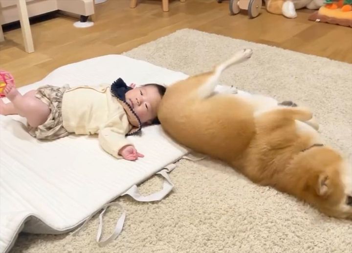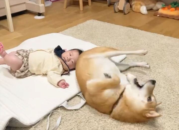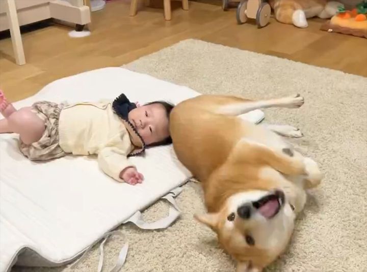 赤ちゃんの面倒を見てくれようとしている柴犬。 寝返りができない赤ちゃんの隣で、手本を見せようとする姿が話題となっています!