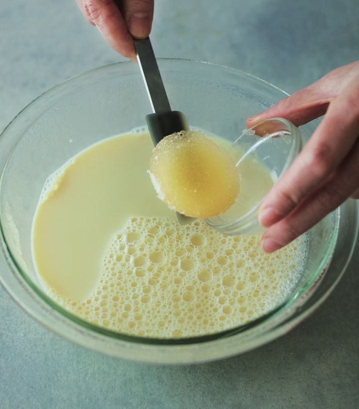 POINT ゼラチンはふやかすと、水分に溶けやすくなる。豆乳がムラなく均一にかたまるように、ゼラチンをよく混ぜて全体に行き渡らせて。
