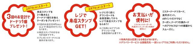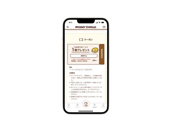 会計前にレジでミスタードーナツアプリの会員証画面をレジでかざす、またはネットオーダーを利用すると、1回のお会計324円(税込)以上でスタンプが1つ貯まります。1日1回1店舗に限り来店スタンプが貯まり、3つ集めると「ドーナツ1個引き換えクーポン」がプレゼントされます。