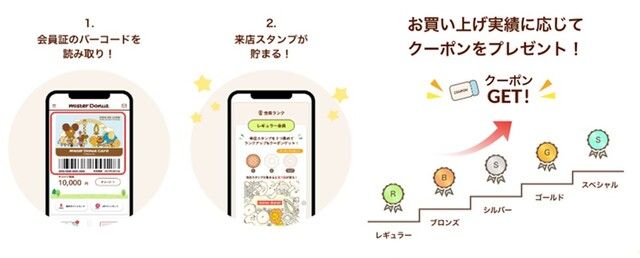 会員ランクに応じたクーポンがもらえるプログラム「会員ランク制度」もあります。ミスドネットオーダーでの利用を含む、来店での利用ごとに「来店スタンプ」が貯まり、3つ貯めると会員ランクがステージアップ。ランクはレギュラーからスペシャルまであります。