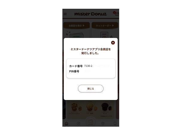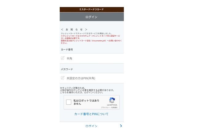 氏名や生年月日などを入力して会員登録をすると、ミスタードーナツアプリ会員証が発行されます。カード番号とPINで、「チャージ」のアイコンからログインします。