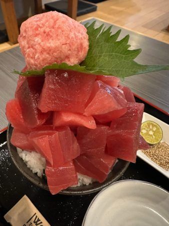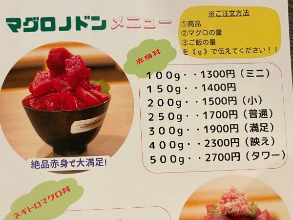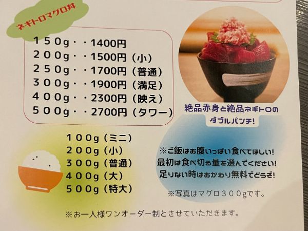 値段はマグロの量で決まります。初心者はあまり冒険をしないよう笑。ご飯の量も自由に選べますよ。